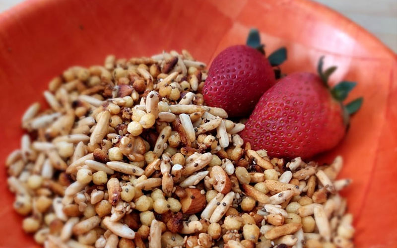 - Mezclar la quinoa y el arroz inflado con las nueces, almendras, semillas y la miel hasta que se integren bien.