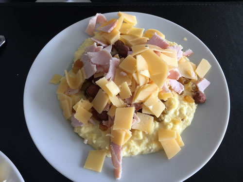 - Servir el revuelto y cubrirlo con cubos de jamón, queso y un puñadito de almendras y pasas.