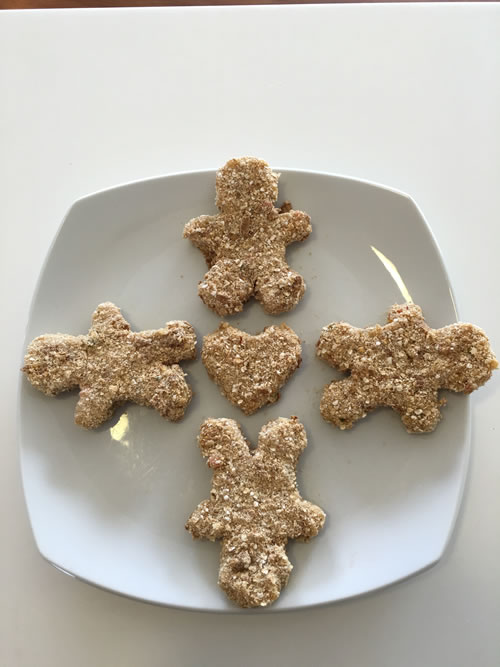 Estirar la pasta sobre una tabla con papel film por arriba hasta que tenga un cm de espesor. Cortar formitas y rebozarlas en una mezcla de huevo y salvado de avena.