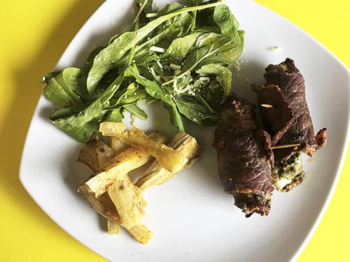 - Extender la pasta sobre la carne y enrollar. Sostener con un escarbadientes cada rollito y llevar a una placa con aerosol vegetal.